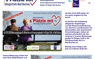 Im Verbund mit dem Verein "Bürger für Bürger Bad Buchau e.V. " erweitern wir unser Angebot und bieten Ihnen Betreuung und Fürsorge im Rahmen einer Betreuungsgruppe an.