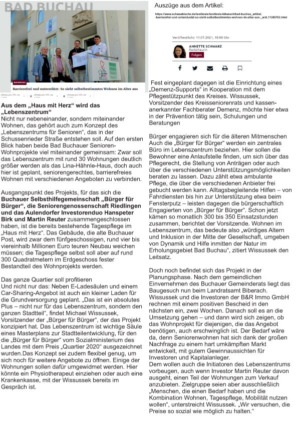 Ausgangspunkt des Projekts, für das sich die Buchauer Selbsthilfegemeinschaft „Bürger für Bürger“, die Seniorengenossenschaft Riedlingen und das Aulendorfer Investorenduo Hanspeter Birk und Martin Reuter zusammengeschlossen haben, ist die bereits bestehende Tagespflege im „Haus mit Herz“. Das Gebäude, die alte Buchauer Post, wird zwar dem fünfgeschossigen, rund vier bis viereinhalb Millionen Euro teuren Neubau weichen müssen; die Tagespflege selbst soll aber auf rund 300 Quadratmetern im Erdgeschoss fester Bestandteil des Wohnprojekts werden.