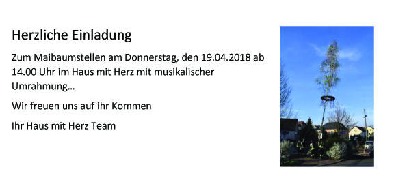 Zum Maibaumstellen am Donnerstag, den 19.04.2018 ab 14.00 Uhr im Haus mit Herz mit musikalischer Umrahmung.
